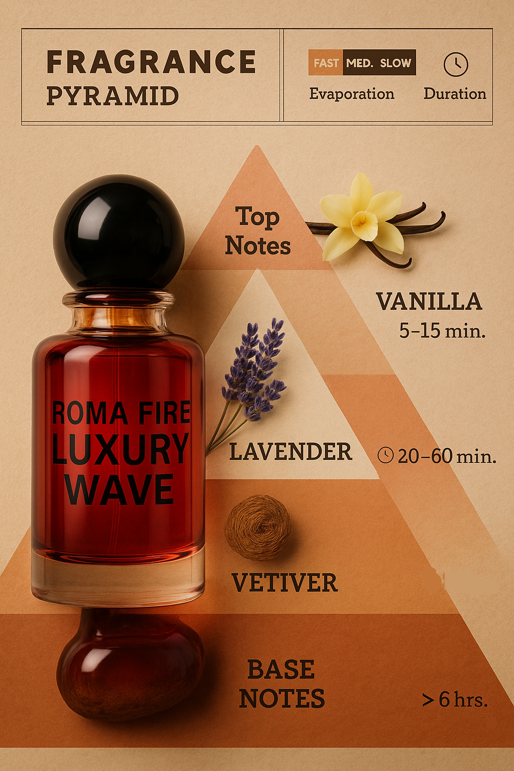 ROMA FIRE ignites the spirit of rebellion and passion. It is the scent of ambition wrapped in flames — a bold fusion of heat and refinement. The fragrance opens with the spark of Citrus and Spiced Amber, setting the tone for energy and confidence. In its heart, Lavender and Vetiver blend to reveal a sophisticated strength, grounded yet untamed. The base of Smoked Woods and Musk lingers with a magnetic warmth — powerful, masculine, and unforgettable.